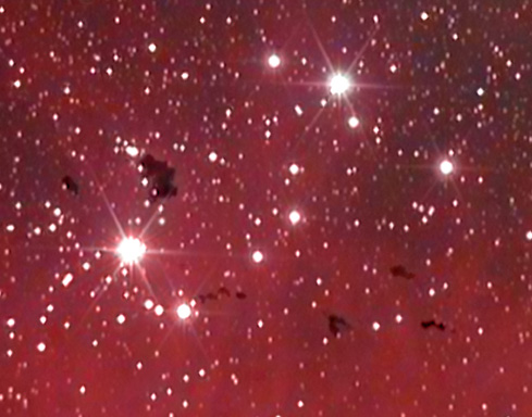 These are dark dust motes that are being eroded away by the nearby hot and luminous stars. The cluster of stars are known as the Centaurus OB 2 association and contains one of the richest groups of luminous O and B stars in the southern sky (info from ESO's Exploring the Southern Sky).