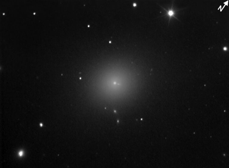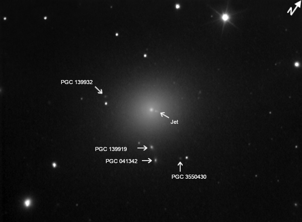 Brightness of galaxy is 8.6 magnitude, distance about 60 million light years (RV = 1264 k/s).