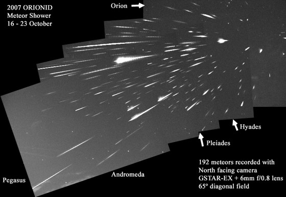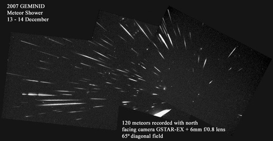 This combination image shows 120 Geminid meteors recorded on the 13th and 14th of December 2007.