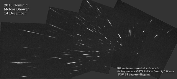 This combination image shows 102 Geminid meteors recorded on the 14th of December 2015 with north facing camera.