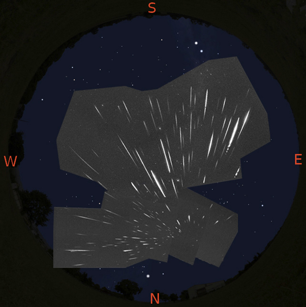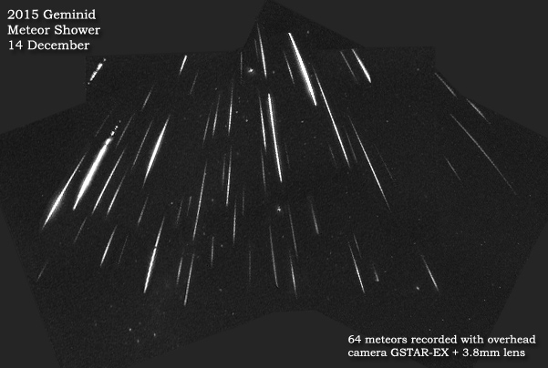 This combination image shows 64 Geminid meteors recorded on the 14th of December 2015 with the overhead camera.