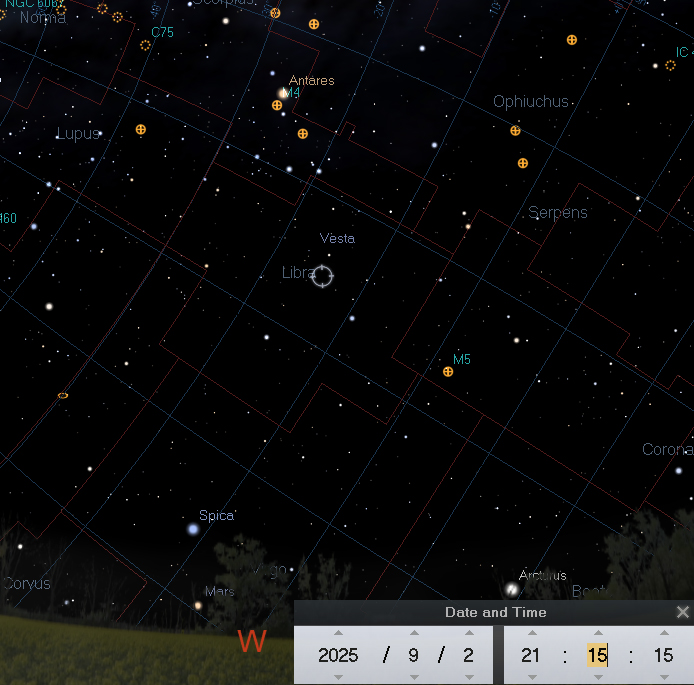 Info from JPL Horizons App. 2025-Sep-02 11:00UT m RA 15 26 06.68 Dec -14 18 26.6 Magnitude 16.119