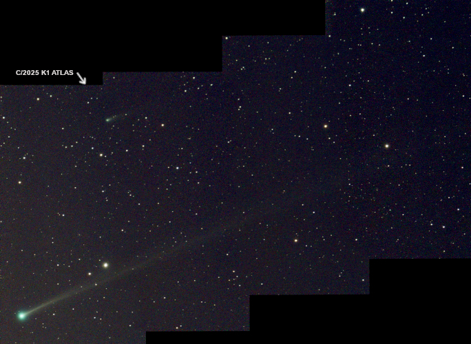 After a long run of bad weather here, I finally got a clear night on 24th August 2025. I had taken a few shots trying to get the interstellar comet 3I/ATLAS with the Seestar but must have had the wrong field. I downloaded a new ephemeris from JPL Horizons App. and picked it up straight away. This little sequence has a 5 mins exposure, 30 mins exp showing the comet trailing and another 5 mins exp to finish.